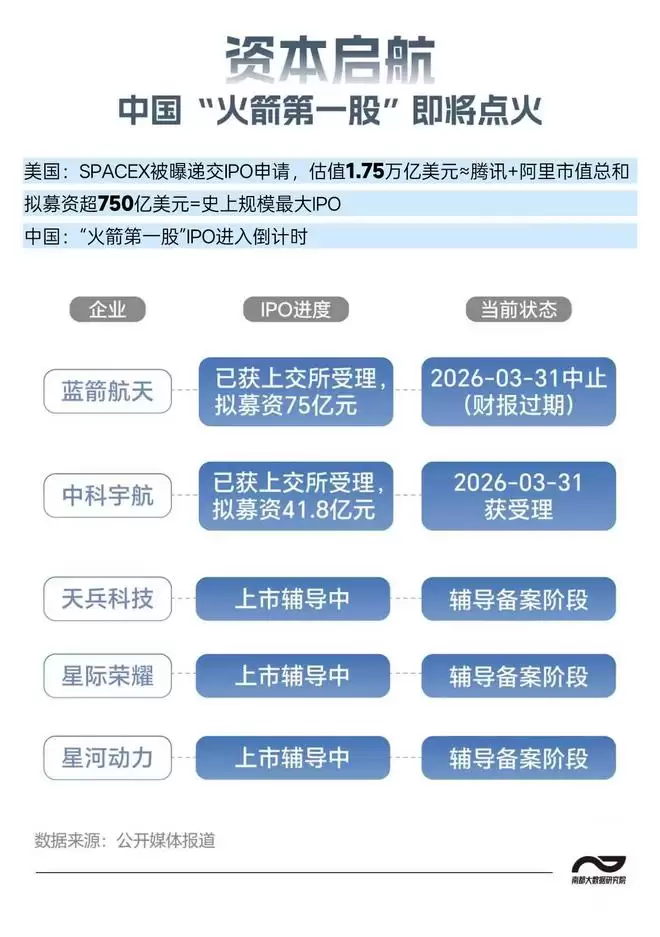 目前,蓝箭航天IPO于2025年12月31日获受理,拟募资75亿元;中科宇航亦于2026年3月31日获受理,拟募资41.8亿元。两者被视为“商业火箭第一股”的有力竞争者。此外,天兵科技、星际荣耀、星河动力均已进入上市辅导阶段。目前蓝箭航天IPO因财报过期处于中止状态,需补充提交材料。“商业航天第一股”最终花落谁家尚未可知。