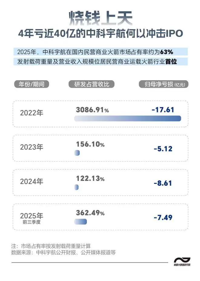 发射场上的高光时刻,并不能掩盖财报上的压力。以3月31日IPO申请正式获受理的中科宇航为例,其招股书显示,2024年至2025年前三季度,公司累计归母净亏损接近40亿元。同期营业收入分别为595万元、7772万元、2.44亿元、8422万元。尽管营收规模持续扩大,但亏损尚未明显收窄。与之对应的是持续高强度的研发投入,报告期内研发费用占营业收入的比例分别高达3086.91%、156.10%、122.13%和362.49%。