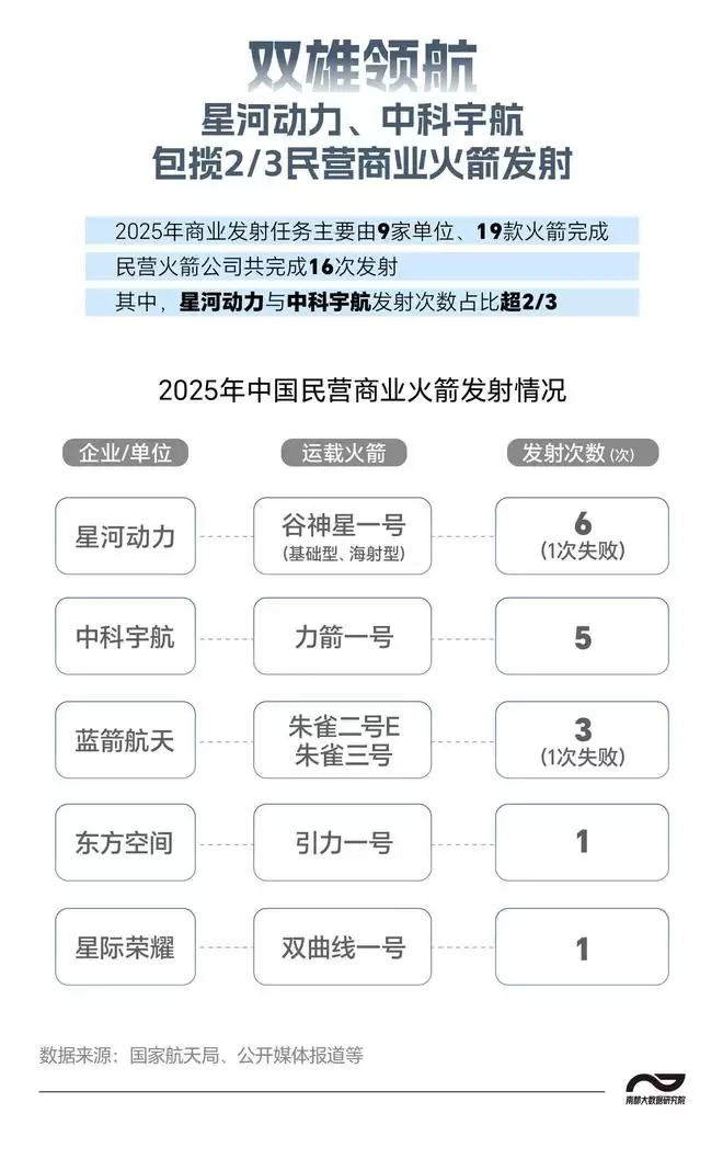但从发射格局来看,行业内部仍呈现出明显的集中趋势。2025年,国内商业发射任务由9家单位、19款火箭共同完成,民营火箭公司全年执行16次发射任务,成功率超85%。其中,星河动力、中科宇航两家头部公司合计发射次数占民营发射总量的三分之二以上,头部效应持续强化,能够稳定执行任务的主体仍然有限。