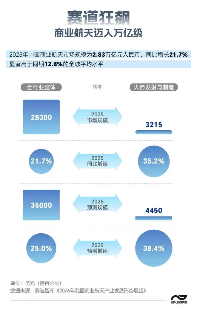从整体规模看,中国商业航天正处于加速扩张阶段。2025年,中国商业航天市场规模达2.83万亿元,同比增长21.7%,显著高于同期12.8%的全球平均水平。其中火箭发射与制造细分市场规模达3215亿元,同比增长35.2%,是增速最快的领域之一。赛迪智库预测,2026年该细分市场规模将达4450亿元,增速进一步攀升至38.4%。