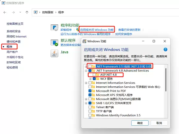 在新打开的界面中,你会看到“程序和功能”下方有一个“启用或关闭Windows功能”的链接,点击它。随后会弹出一个新窗口,在里面找到并勾选上“.NET”相关的选项(通常是.NET Framework 3.5或4.8,根据提示选择即可)。