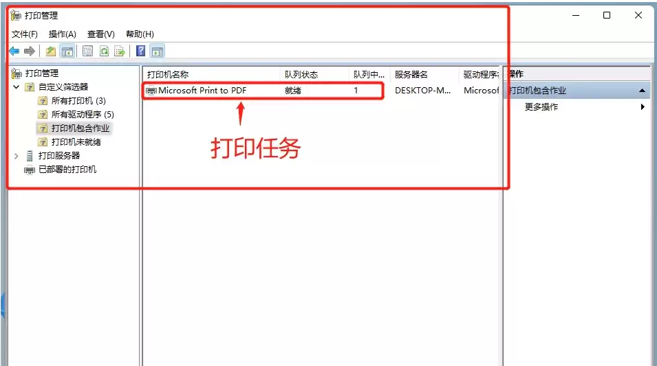 这时,系统会弹出一个“打印管理”窗口。你把左侧的树状目录展开,找到并点击【自定义筛选器】下的【打印机包含作业】这一项。