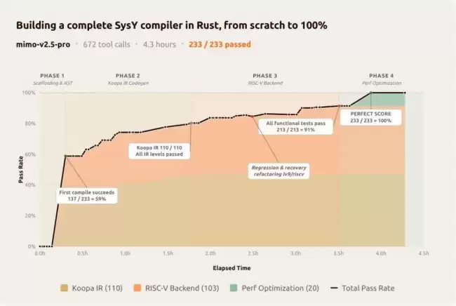这个任务源自北京大学的《编译原理》课程项目,要求从零开始,用Rust语言实现一个完整的SysY编译器,包括词法分析、语法分析、抽象语法树(AST)、Koopa IR中间代码生成、RISC-V汇编后端以及性能优化。要知道,北大本科生完成这个项目通常需要数周时间。然而,MiMo-V2.5-Pro仅用了4.3小时,经过672次工具调用,就交出了满分答卷——在隐藏测试集上取得了233/233的满分。这背后展现的,是极高的工程效率和生产力价值。