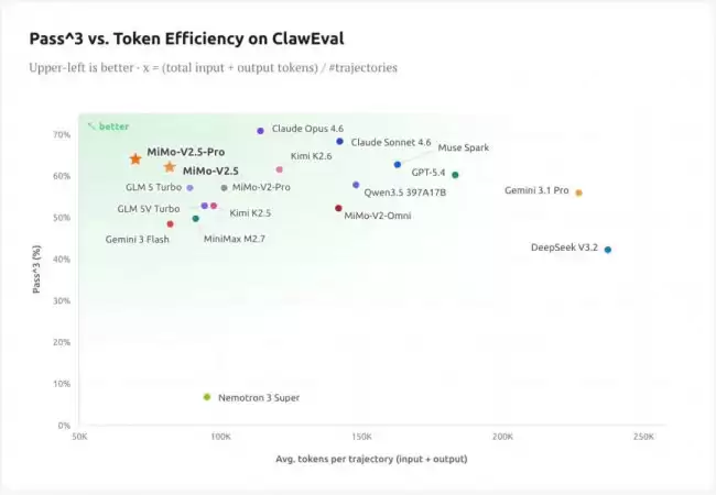除了能力提升,这一代模型在“经济性”上也下足了功夫。MiMo-V2.5全系列都针对Token效率进行了深度优化,目标是用更少的Token完成更多的事。