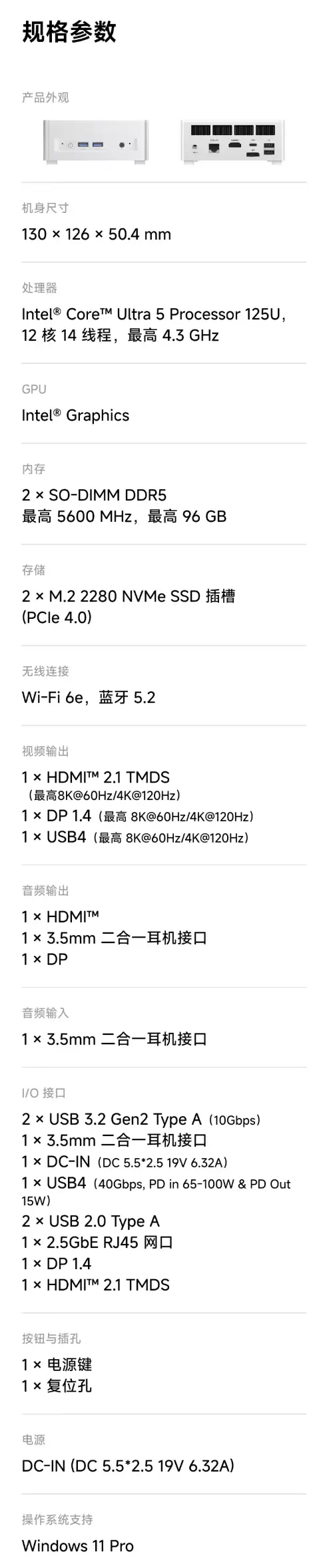 先看机身。这款迷你主机的三围控制在130×126×50.4毫米,重量仅为0.6公斤,属于典型的“巴掌大小”。为了压住处理器性能释放,它采用了支持35W TDP的相变导热材料配合涡轮风扇的散热方案,官方标称工作噪音低于45分贝,力求在性能和静音间找到平衡。