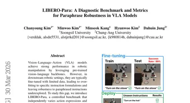 这个看似简单却影响深远的问题,最近被韩国崇实大学和中央大学的研究团队系统性地剖析并取得了关键进展。相关成果已发布于2026年3月的arXiv预印本平台(论文编号:arXiv:2603.28301v1)。研究不仅量化了当前机器人在理解同义指令时的严重短板,更构建了一套全新的评估体系,用以衡量其“语言理解韧性”。