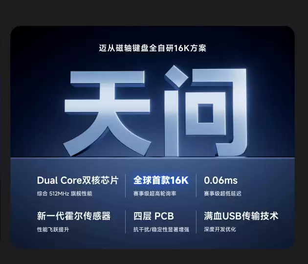 说到产品力,迈从的思路很清晰:一切自研技术,最终都得落到实实在在的用户体验上。就拿其明星产品Ace 68 GT磁轴键盘来说,它搭载了品牌自研的磁轴算法3.0和全自研的天问方案。这套组合拳实现了什么效果?全球首款16K赛事级回报率,以及0.06ms的超低延迟。对于FPS游戏玩家而言,这意味着近乎零延迟的跟手操作体验,毫厘之间的差距,往往就此决定。