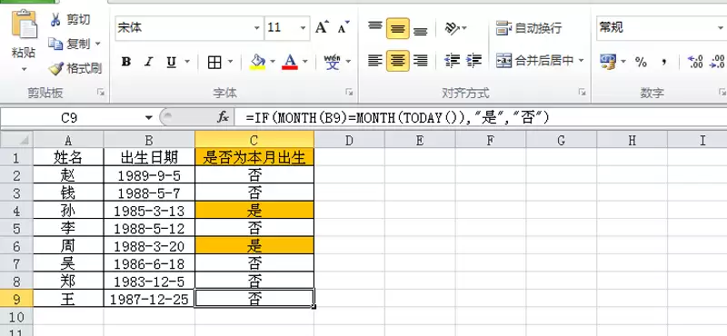 第二步,是核心的逻辑判断。在需要显示提醒的单元格(比如C2)输入公式:=IF(MONTH(B2)=MONTH(TODAY()),"是","否")。这个公式的作用很巧妙:它用MONTH函数分别提取生日和当前日期的月份进行比对。如果月份相同,就返回“是”,否则返回“否”。按下回车,第一个判断结果就出来了。