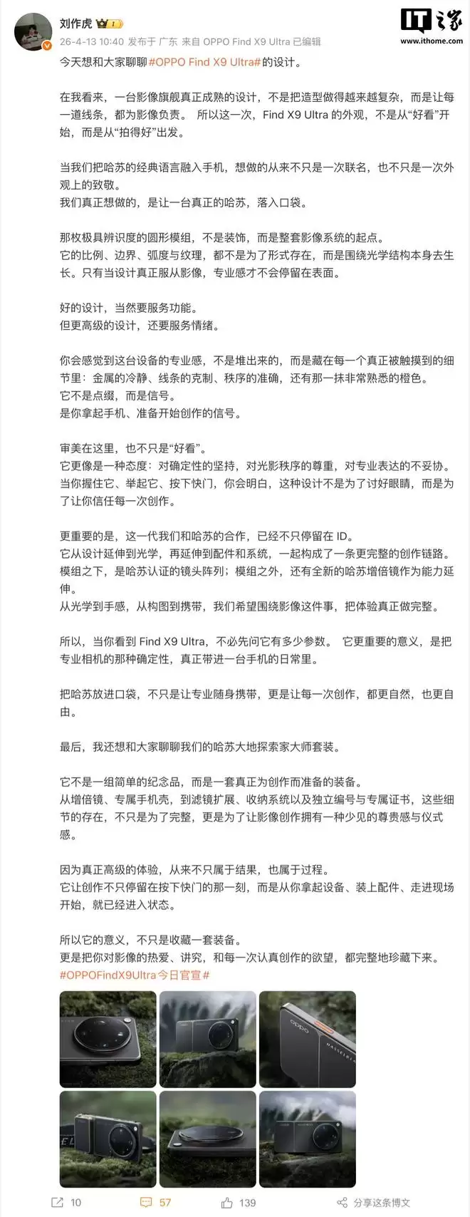 今天上午,OPPO首席产品官刘作虎的一篇长文,为我们揭示了Find X9 Ultra设计背后的深层逻辑。其核心观点颇为鲜明:这款手机的设计起点,并非追求视觉上的“好看”,而是为了终极的“拍得好”。