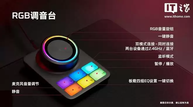 阿尔法2还有一个颇具玩味的配件:全球首款可编程RGB控制台。这个控制台配备了一个带RGB灯效的旋钮和六个可自定义按键,集成了音量调节、一键静音、麦克风监听、EQ切换乃至多设备控制等功能。通过HyperX Engine软件,玩家可以对这些按键的功能进行深度自定义,把常用的音频操作都放在手边,这无疑是追求极致体验的玩家所乐见的。