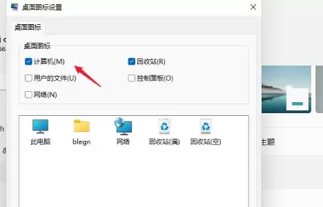 第四步: 这时会弹出一个设置窗口。在“桌面图标”下方,勾选“计算机”。当然,你也可以顺手把“用户的文件”、“网络”等其他常用图标一并勾选上。最后,点击“确定”按钮保存设置。