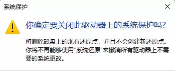 5. 系统会最后一次向你确认。它会提醒你:关闭保护将删除该驱动器上所有的现有还原点,并且不再创建新的。这意味着,你将无法再使用“系统还原”功能来撤销系统更改。如果考虑清楚了,就点击【是】来完成关闭操作。