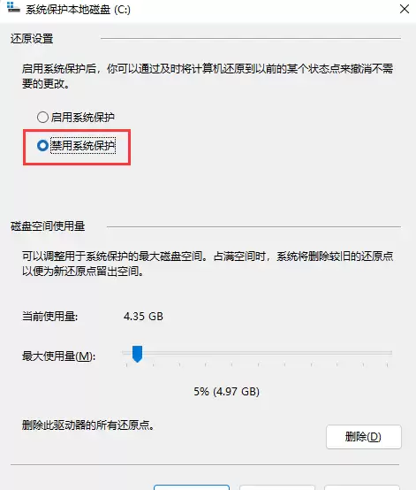 4. 在新弹出的“系统保护本地磁盘”窗口中,关键一步来了:选择【禁用系统保护】这个选项,然后果断点击下方的【确定】。