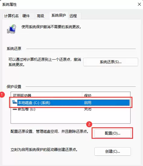 3. 紧接着,你会看到“系统属性”窗口。将选项卡切换到【系统保护】。在“保护设置”区域,选中你的系统盘,通常是【本地磁盘 (C:) (系统)】,然后点击旁边的【配置】按钮。这个按钮负责管理还原设置和磁盘空间。