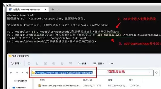 6. 然后,输入 “Add-AppxPackage” 命令,后面跟上安装包的具体文件名(包括后缀)。例如:Add-AppxPackage .\MicrosoftCorporationII.WindowsSubsystemForAndroid_1.7.32815.0_neutral___8wekyb3d8bbwe.Msixbundle。