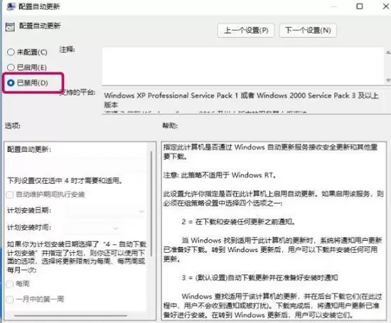在右侧的策略设置列表中,找到“配置自动更新”并双击打开。在弹出的窗口中,将其状态设置为“已禁用”,然后点击“应用”和“确定”。