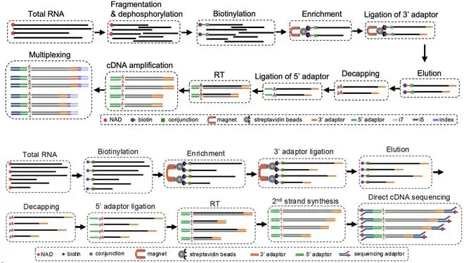NAD+是细胞能量代谢的核心辅酶,身份特殊。令人惊奇的是,它还能作为RNA合成的起始核苷酸,在转录一开始就被“缝合”到RNA链的起始端,形成所谓的NAD-RNA。然而,技术瓶颈一直横亘在前:科学家们很难精确定位这些NAD-RNA的转录起点,对于那些长度较短的NAD-RNA,更是难以有效捕获,导致大量信息在检测中被遗漏。