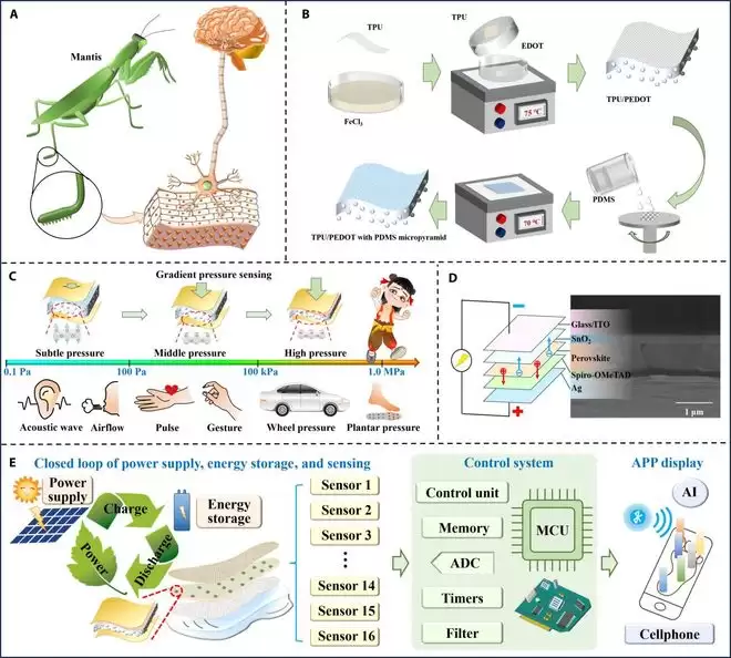 那么,破局点在哪里?研究团队从大自然中找到了灵感。螳螂捕食时,腿部既要感知猎物的微弱动静,又要承受自身快速移动的强大冲击。这种分级机械传感结构给了团队重要启发。