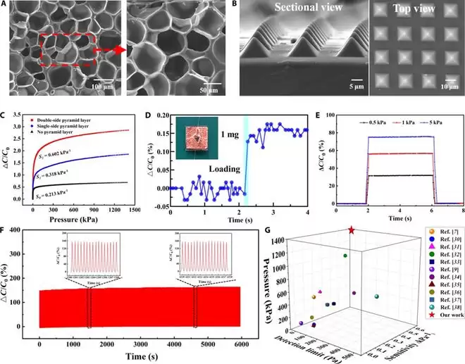 受此启发,团队设计出双微结构电容传感器,一举实现了高灵敏与宽量程的统一。其检测下限低至0.10帕斯卡——相当于羽毛轻触脚底的力度;最大量程却高达1.4兆帕,足以承受剧烈运动时的瞬间强冲击。更关键的是,即便经过12000次循环加载测试,传感器性能依然保持稳定。