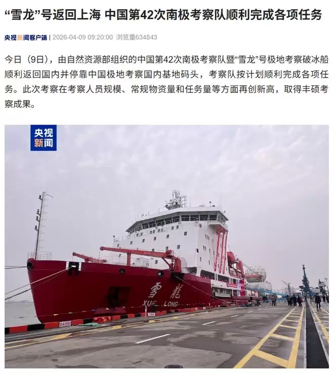4月9日,一个值得记录的日子。随着“雪龙”号极地考察破冰船稳稳停靠在中国极地考察国内基地码头,由自然资源部组织的中国第42次南极考察队宣告顺利返回。这不仅标志着一次远航的结束,更意味着我国南极科考事业又向前迈出了坚实一步。本次考察在人员规模、物资量和任务量上均刷新了纪录,取得的成果自然也是沉甸甸的。