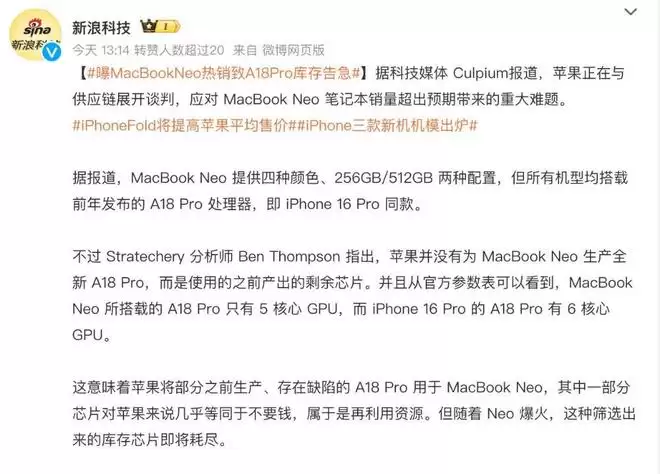 问题出在哪里?关键在于那颗“心脏”。据Stratechery分析师Ben Thompson指出,苹果并未为MacBook Neo专门生产全新的A18 Pro芯片,而是巧妙地利用了此前生产环节中筛选出的库存芯片。这一策略原本能有效控制成本,但随着Neo系列突然爆火,这批精打细算规划出来的库存芯片,即将消耗殆尽。