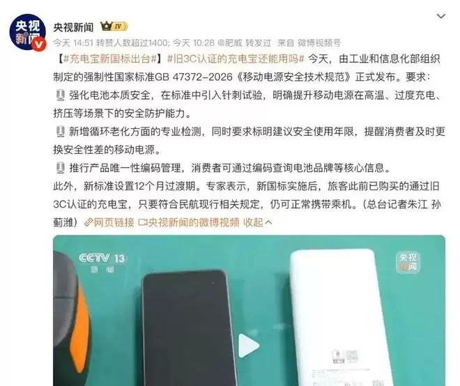 近日,一则关乎所有消费者日常用电安全的消息正式落地。工业和信息化部会同有关部门制定的强制性国家标准《移动电源安全技术规范》(GB 47372—2026)正式对外公布,并将于2027年4月1日起正式实施。这意味着,移动电源产品的安全门槛将迎来一次系统性的全面升级。