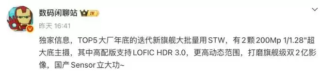 视线放得更远一些,小米后续的数字旗舰系列也传来了新的技术风向。近日,数码博主@数码闲聊站 爆料称,TOP5大厂年底的迭代新旗舰将大批量采用STW技术,并搭载2颗200Mp 1/1.28"超大底主摄。其中高配版更将支持LOFIC HDR 3.0技术,实现更高的动态范围,旨在打磨“旗舰级双2亿影像”。爆料最后感叹“国产Sensor立大功”,虽未指明具体系列,但外界普遍推测这很可能指向小米18系列。