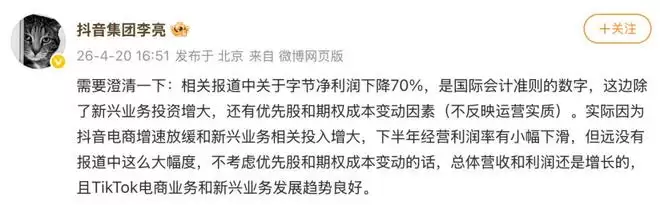 一则关于字节跳动2025年净利润大幅下滑的报道,在业界激起了不小的水花。很快,抖音集团副总裁李亮在社交平台做出了正式回应,对关键数据进行了澄清。