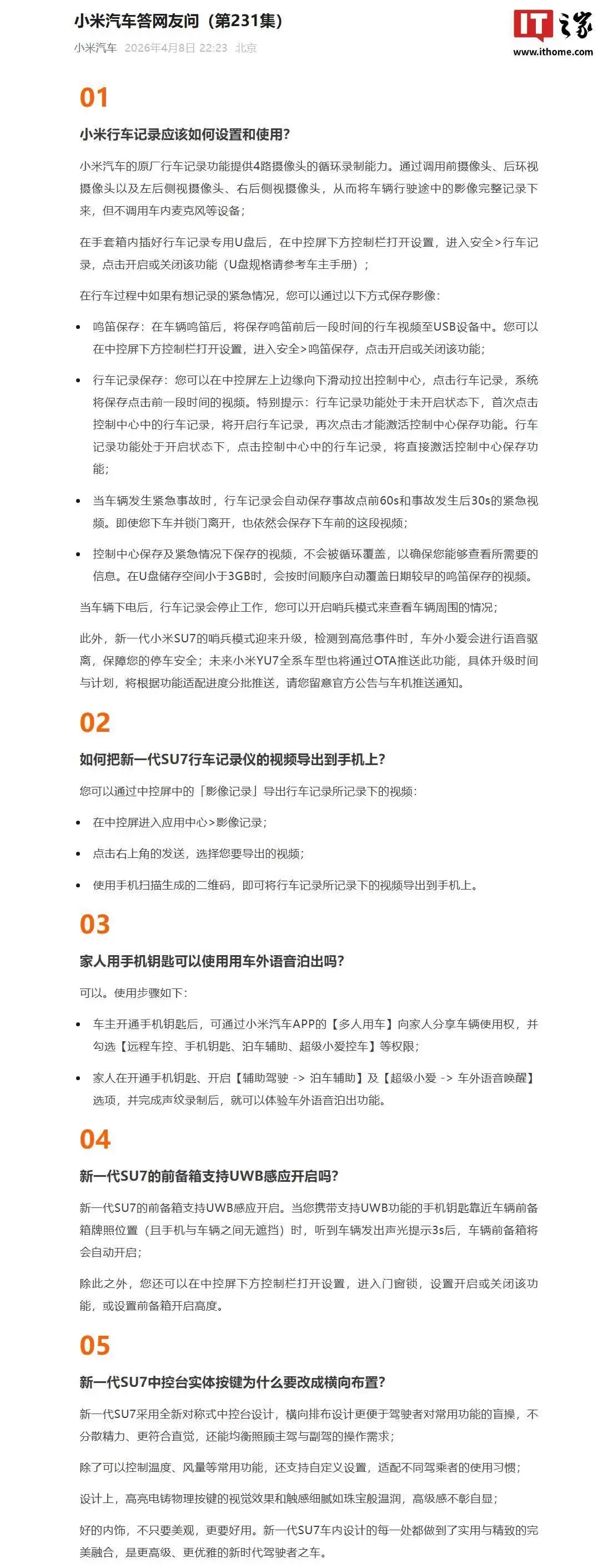 总的来看,这期“答网友问”解答的,都是用户在实际用车过程中可能遇到的具体问题。从行车记录到权限管理,小米汽车正在通过这些细致的功能说明和持续的OTA升级,不断优化车主的用车体验。对于车主而言,花点时间了解这些功能,能让这辆智能汽车更好地为你服务。