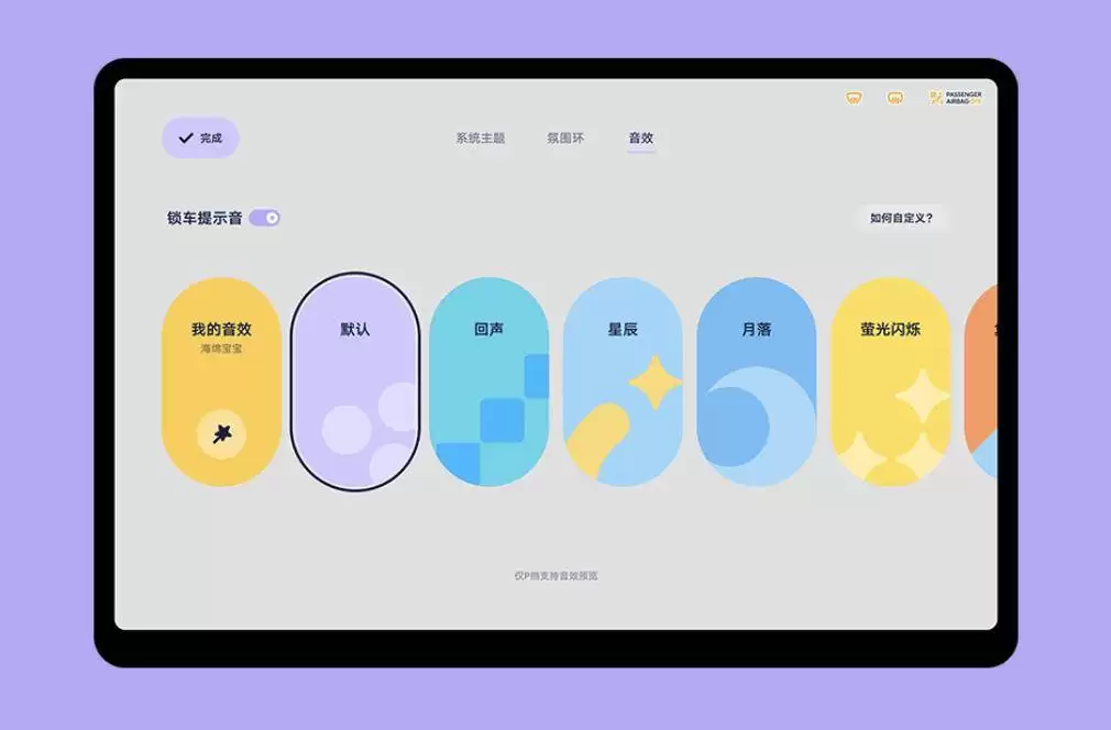 如果说安全和实用是基础,那么个性和趣味就是这次交互升级的灵魂。现在,你可以自定义锁车音了。除了系统预设的几种声音,还能通过U盘上传自己喜欢的音效,打造独一无二的上下车仪式感。