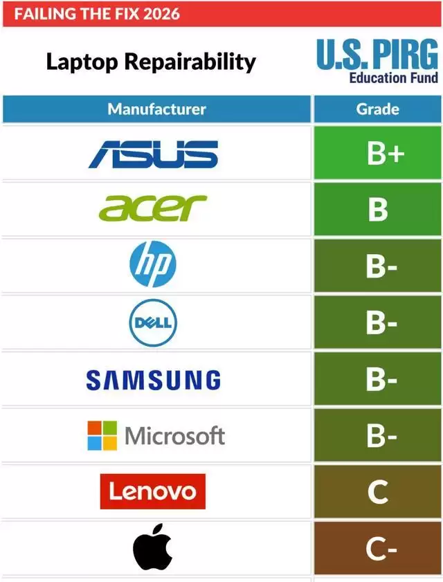 在最新的笔记本可维修性排名中,华硕连续第三年位居前列,而苹果则毫无意外地在榜单底部“领跌”。报告指出,苹果得分低迷的核心症结在于其设备的拆解难度过高,内部结构设计和固定方式使得第三方或普通用户的维修成本极其高昂。雪上加霜的是,苹果、戴尔和三星因为同时是TechNet与CTA的成员,被额外扣除了整整1分。联想则以C减的成绩排在倒数第二,同样被指出在拆解评分上表现不佳。
