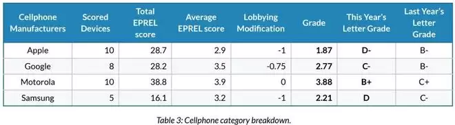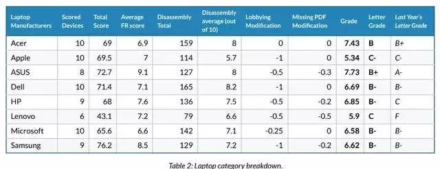 PIRG“维修权”项目高级主管内森·普罗克特对此进行了解释:公司加入这些组织,未必意味着它们在每个具体议案上都公开反对维修权,但客观上,其会费资助了那些反对相关立法的团体,因此在评分中必须有所体现。结果就是,今年被评估的笔记本厂商中,除了宏碁,其余品牌都因此被扣分;手机领域,也只有摩托罗拉逃过了这项减分。