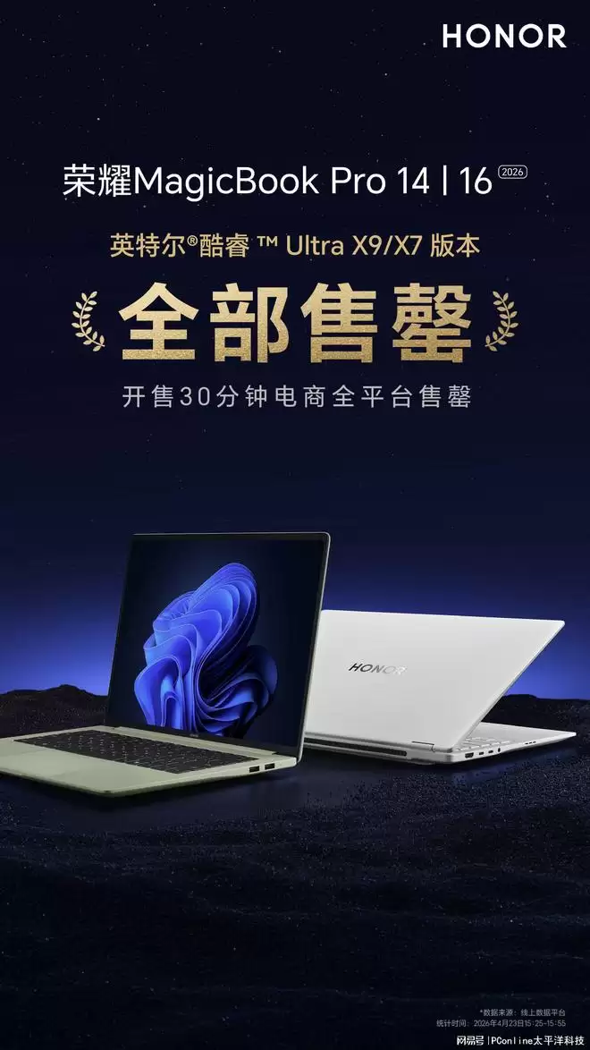 4月23日,荣耀WIN游戏本暨全场景新品发布会如期而至,一系列重磅新品集中亮相。其中,荣耀MagicBook Pro 14与荣耀MagicBook Pro 16两款旗舰轻薄本的强势上新,以其硬核实力,堪称同级产品中的领跑者。市场反响极为热烈,开售仅30分钟,搭载英特尔®酷睿™ Ultra X7/X9处理器的版本就在电商全平台宣告售罄!同台亮相的,还有荣耀笔记本X Plus系列2026、MagicPad3 Pro 12.3以及新款头戴式耳机2。