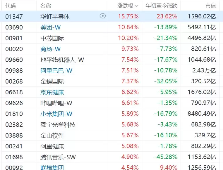 个股的表现更是精彩纷呈,多点开花。半导体板块率先领跑,华虹半导体气势如虹,股价大幅拉升超过15%;行业龙头中芯国际也紧紧跟随,涨幅站上10%大关。人工智能领域的代表商汤-W同样表现不俗,上涨超过9%。