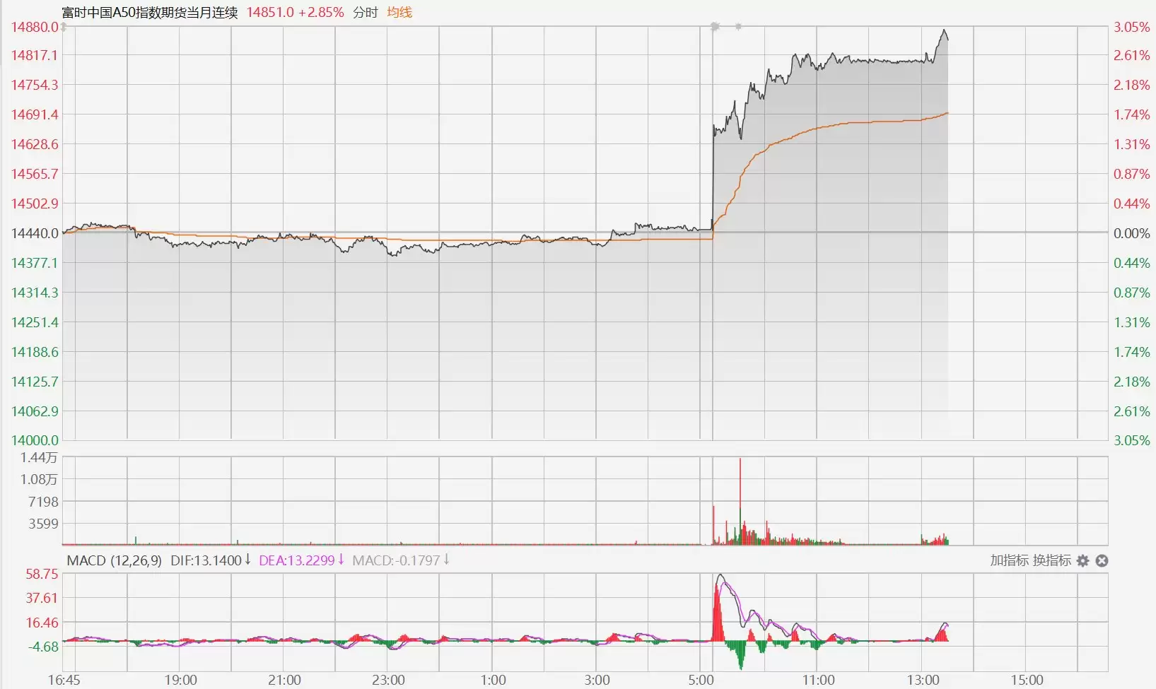 市场的反应有时候就是这么直接,几乎不给任何人反应的时间。就在今天,富时中国A50指数期货的表现,无疑给市场注入了一针强心剂。短短时间内,其涨幅迅速拉升至超过3%,站上了14880点。