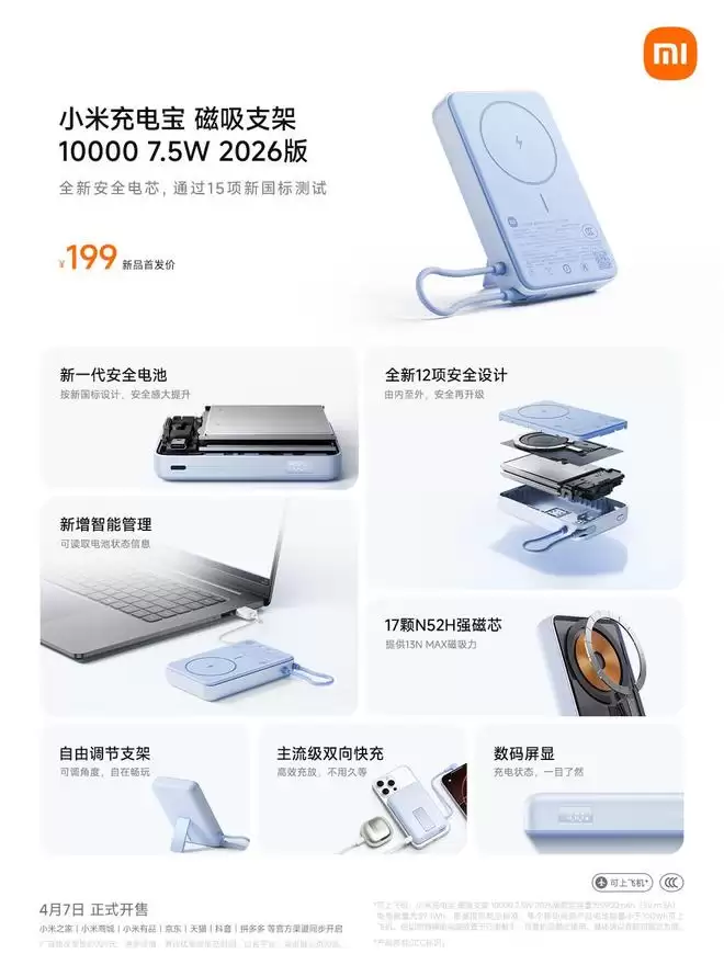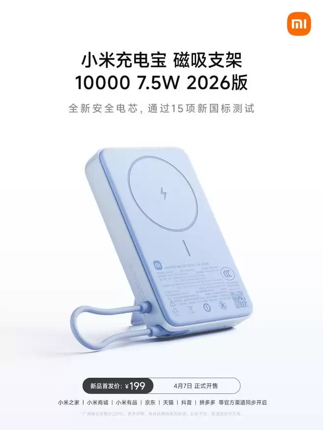 4月8日消息,小米旗下首款满足最新强制性国家标准的充电宝产品正式亮相。这款名为“小米充电宝磁吸支架 10000 7.5W 2026版”的新品现已开售,首发价格为199元。