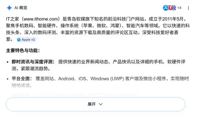 例如搜索IT之家,跳出的 AI 概览介绍