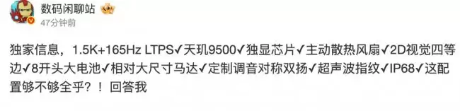 其实,关于这款新机的具体样貌,业内已有不少传闻。早前,知名爆料博主 @数码闲聊站 就曾透露过一组信息,与今日官宣的亮点高度吻合:一款搭载天玑9500芯片的新机将配备1.5K分辨率的165Hz LTPS屏幕,并拥有独显芯片和主动散热风扇。这些信息对上了K90 Max的“狂暴双芯”和风冷散热。