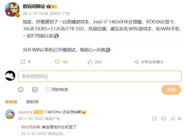 进入2026年3月,新品的消息更加密集。3月10日,知名数码博主@数码闲聊站爆料,新款游戏本将搭载i7-14650HX处理器和RTX5060显卡,辅以16GB DDR5内存和512GB/1TB SSD的存储组合,同时在散热配置上大幅堆料。该博主当时就建议,这款产品不妨命名为WIN游戏本。