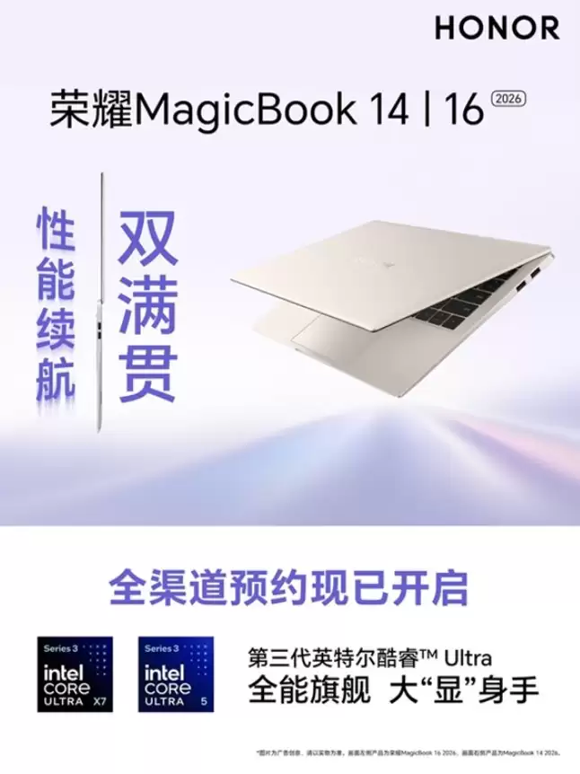 3月30日,荣耀2026款的MagicBook Pro 14/16系列以及MagicBook 14/16系列,已经正式开启了全渠道预约。其中,定位全能旗舰的MagicBook Pro 2026系列,最高搭载了基于先进18A制程和全新Panther Lake架构的第三代英特尔酷睿Ultra X9 388H处理器。在荣耀自研的HONOR Turbo X技术加持下,最高可实现88W的满血性能释放,足以流畅运行主流的3A游戏大作。该系列全系标配92Wh大容量电池,其中14英寸版本在荣耀实验室的标准测试环境下,最长续航达到了惊人的16.7小时,综合续航表现全面超越了同尺寸的苹果MacBook Pro 14,刷新了14英寸轻薄本行业的超长续航纪录。