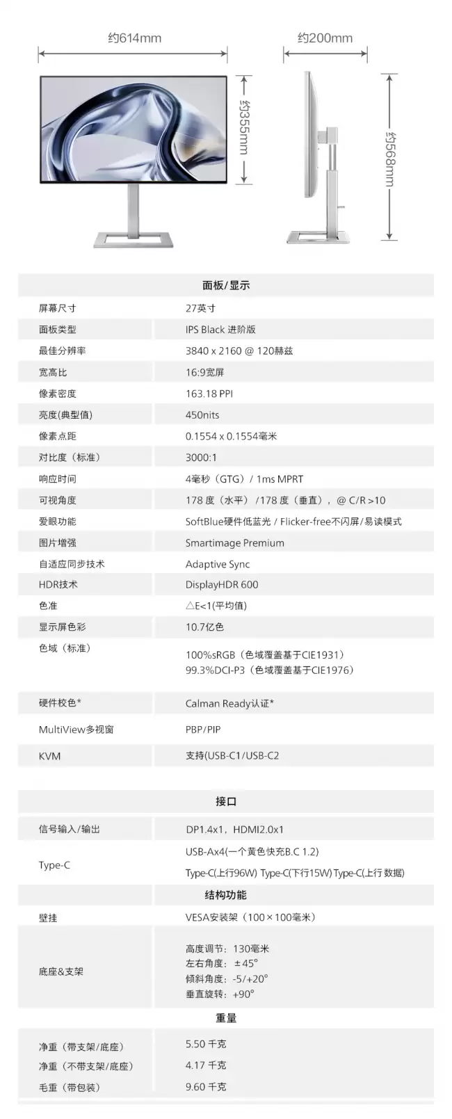 除了屏幕素质,它的实用设计也考虑得很周全。显示器支架支持升降、倾斜和旋转调节,方便用户找到最舒适的观看角度。当然,它也支持VESA 100x100mm标准壁挂,想上支架臂也没问题。接口部分堪称丰富:提供了一个功率高达96W的USB-C接口(既能传输视频信号也能给笔记本充电),一个15W的USB-C接口,一个HDMI 2.0接口,一个DP 1.4接口,以及多达4个USB-A接口,并且支持KVM功能,方便一套键鼠控制多台设备。