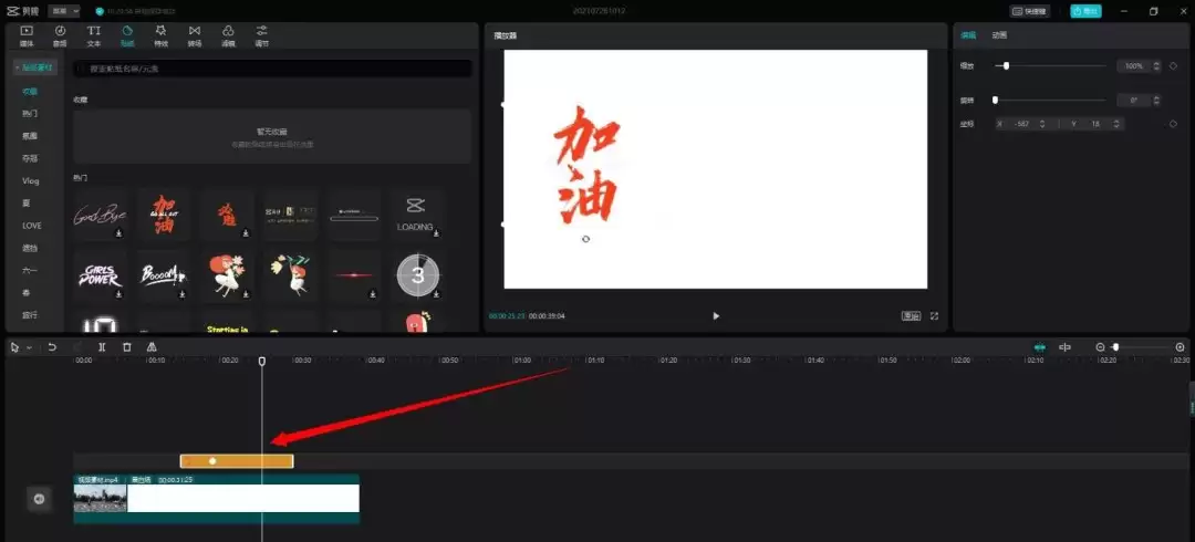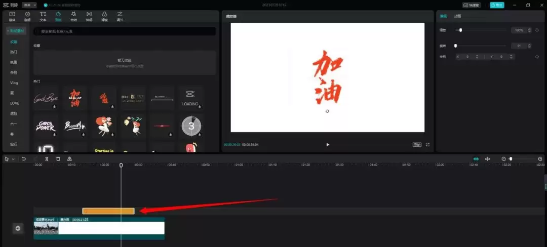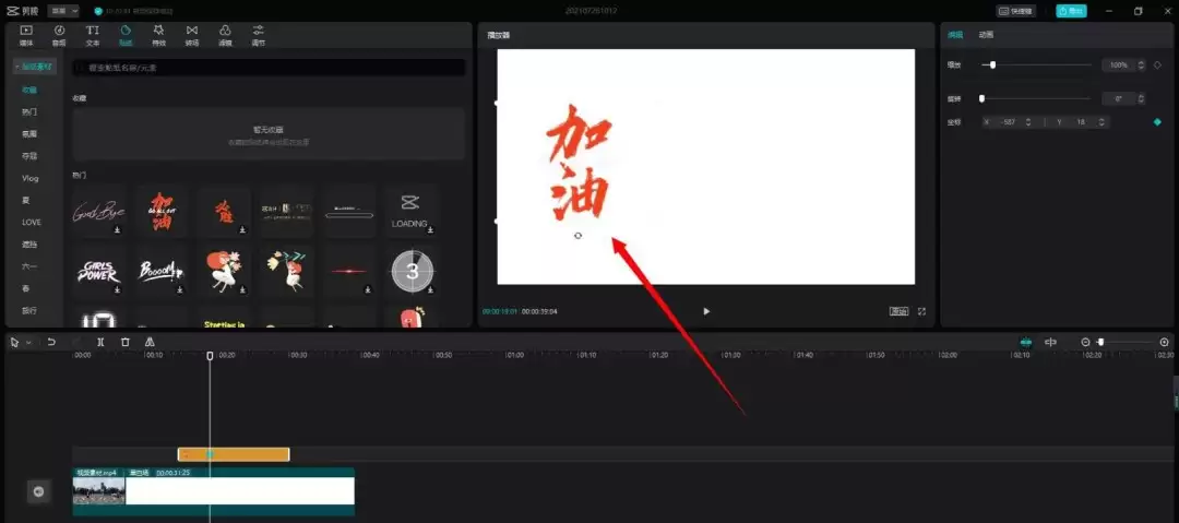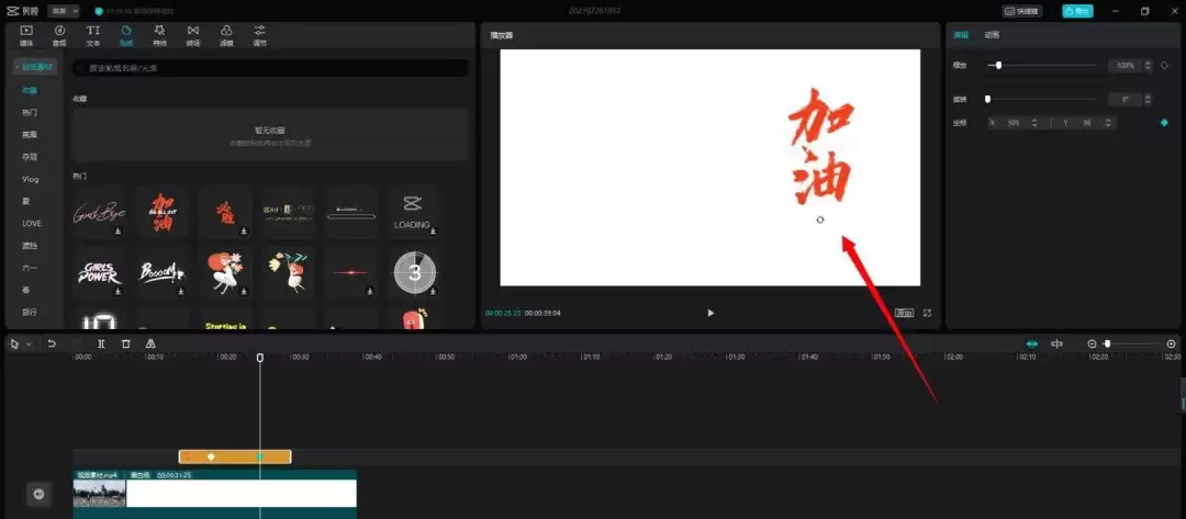 贴纸添加成功后,在时间轴区域找到对应的贴纸片段,用鼠标点击选中它。这一步至关重要,只有选中了目标,右侧的属性调节面板才会出现针对该贴纸的控制选项。