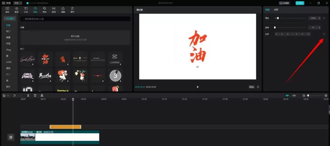 选中贴纸后,目光转向右侧的“画面”属性面板。这里你会找到“位置”参数,它通常带有X(横轴)和Y(纵轴)的坐标值。注意看坐标参数旁边那个小小的菱形图标,它就是关键帧开关。点击一下这个菱形,它会被点亮并显示为蓝色——这表示你已经成功在时间线的当前位置,为贴纸的位置记录下了一个初始状态的关键帧。