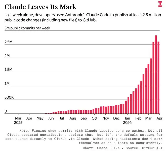 第三方数据完美印证了这一趋势。以Anthropic旗下的Claude Code为例,这款工具向GitHub公开项目提交代码的周频次,在过去六个月内狂增近25倍——从大约10万次,一跃攀升至上周的超过250万次。