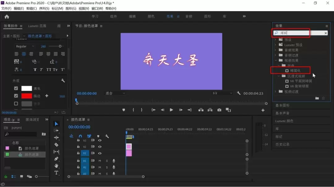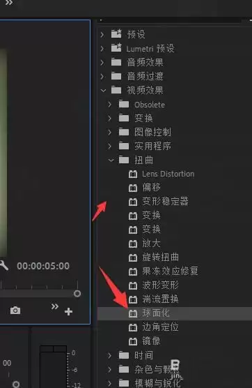 接下来,打开右侧的“效果”面板。在视频效果列表中,找到“扭曲”分类,你会看到里面有一个叫“球面化”的效果。用鼠标将它直接拖拽到时间轴上的文字图层上。