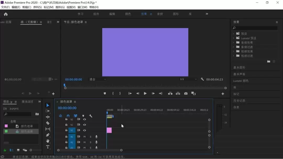 首先,新建一个序列,然后创建一个浅蓝色的颜色遮罩,并将其拖入时间轴轨道作为背景。这样做是为了让后续的文字效果更加清晰可见。