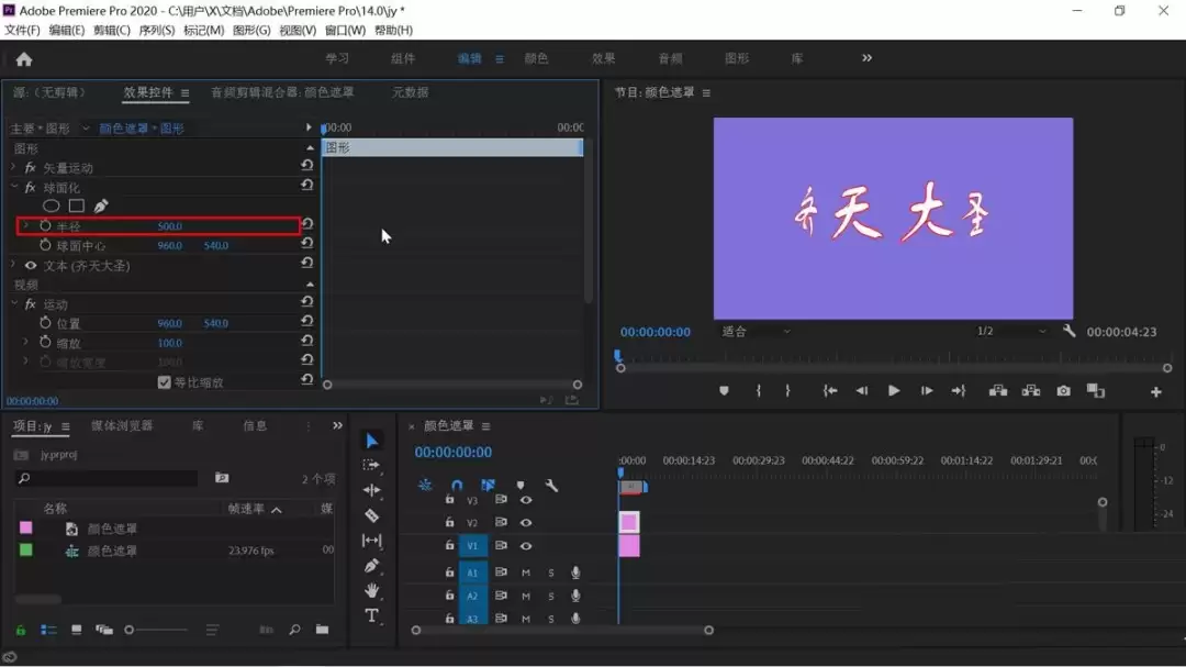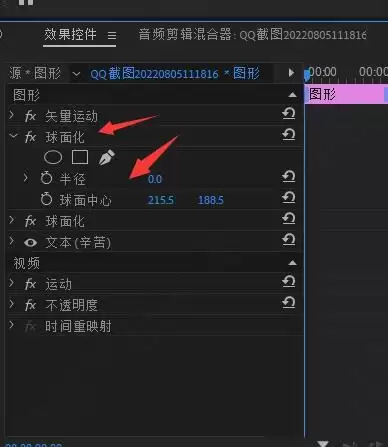 同样,将这个“球面化”效果拖到时间轴的文字图层上。然后,确保文字图层被选中,在“效果控件”面板中找到“球面化”。先将“半径”参数调整到一个较大的值,比如500,让球面效果本身先变得显著。
