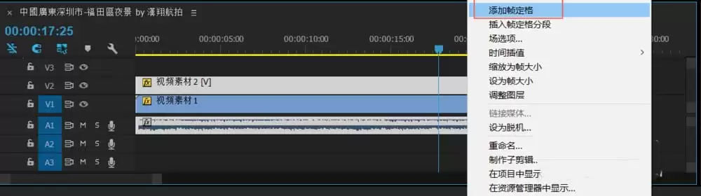 当你希望视频播放到某个点突然定格,之后不再继续播放原画面时,这个方法就非常顺手。操作同样简单:在时间轴上确定好位置,然后在视频素材(还是以V2轨道为例)上右键单击,这次选择【添加帧定格】。