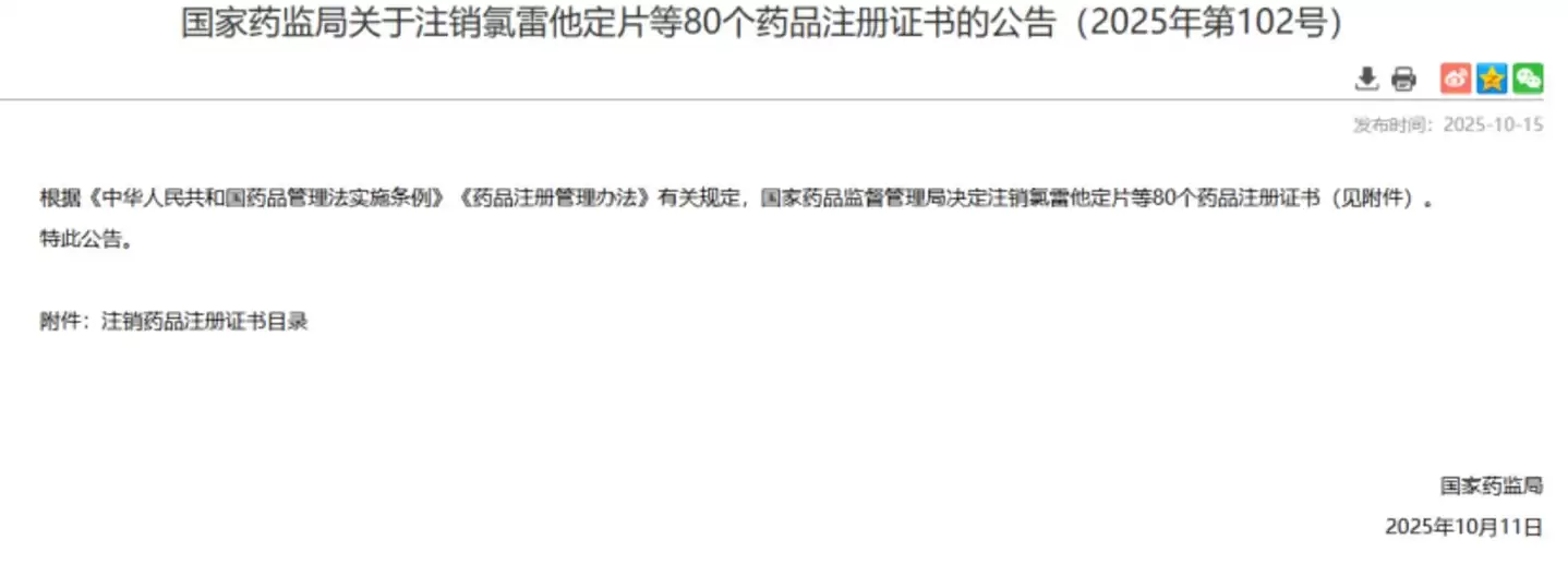 2025年7月,国家药监局宣布注销56个药品的注册证书,其中外资企业的产品超过30个。同年10月,药监局再次发布公告,正式注销氯雷他定片等80个药品注册证书,其中41款被注销药品为进口药,占比超过一半,涉及辉瑞、诺华、默克、拜耳、勃林格殷格翰等多家知名跨国药企。