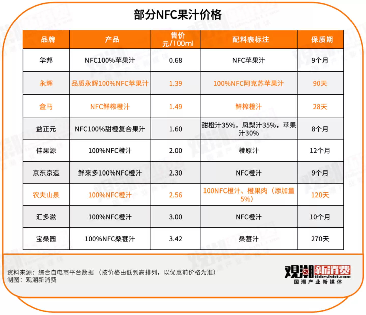 日前北冰洋一款标注添加NFC果汁的葡萄复合果汁,配料表显示NFC葡萄汁添加量为0.005%,遭到网友“一盒只加一滴果汁”的嘲讽;零食品牌“好想来”旗下“好想来甄选”100%橙汁仅有8.5%的NFC果汁添加量,却在包装上标注了大大的“NFC 非浓缩还原”字样,客观上对消费者造成了误导,华邦、养乐兹等品牌也均存在类似问题;还有的混淆“100%果汁”和“100% NFC果汁”的概念,让消费者花高价买到普通浓缩汁。